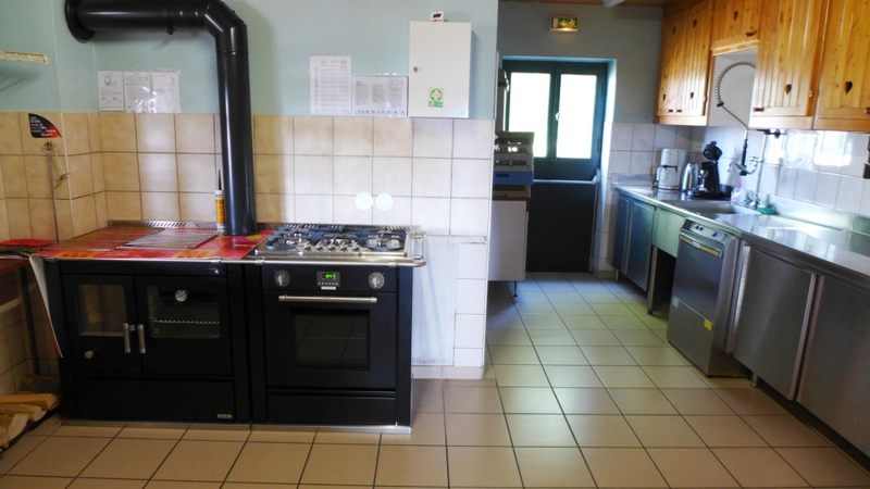 La cuisine est équipée pour un banquet de 50 personnes, permettant un rinçage et un lavage aisés de la vaisselle grâce à un évier et lave-vaisselle